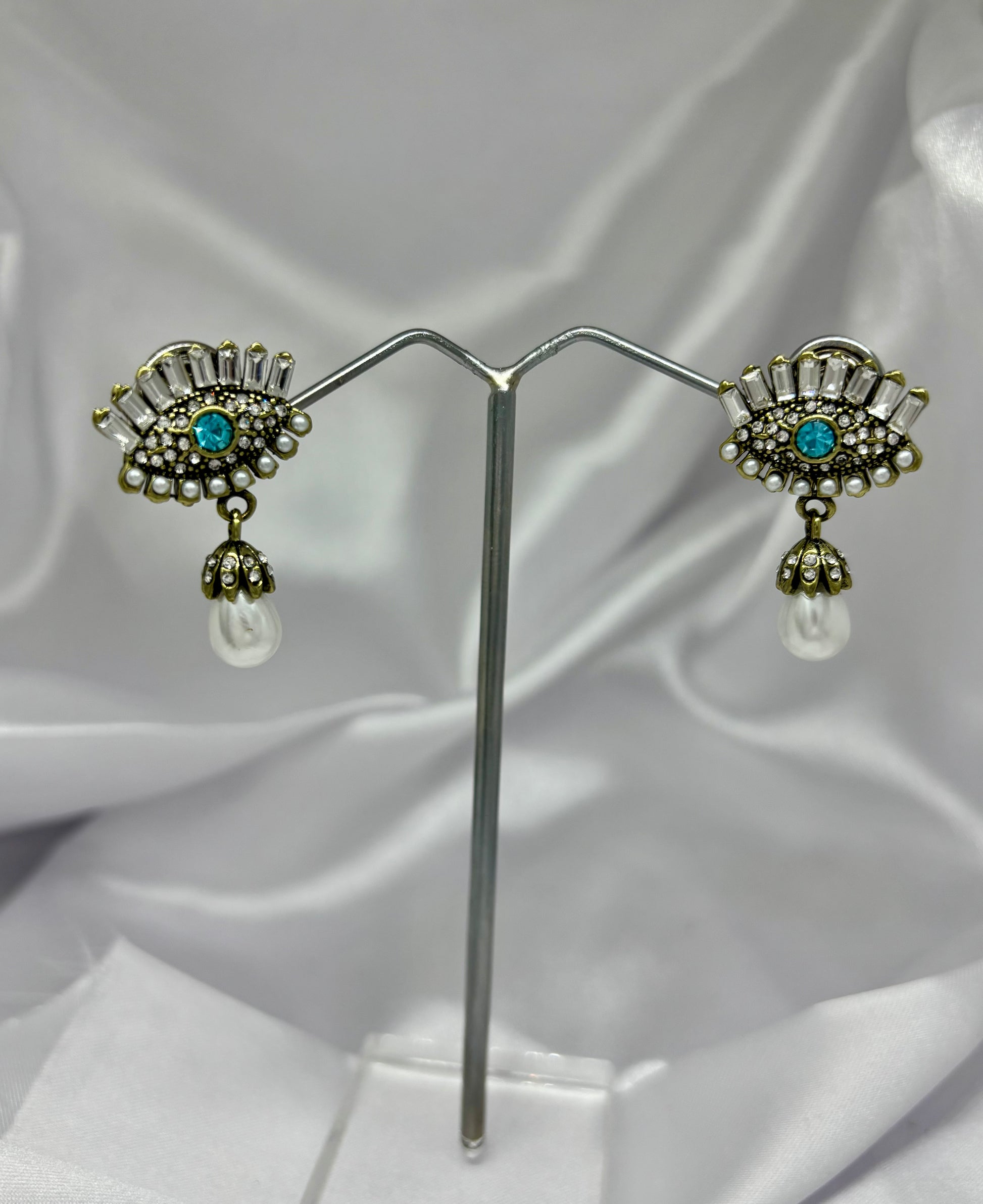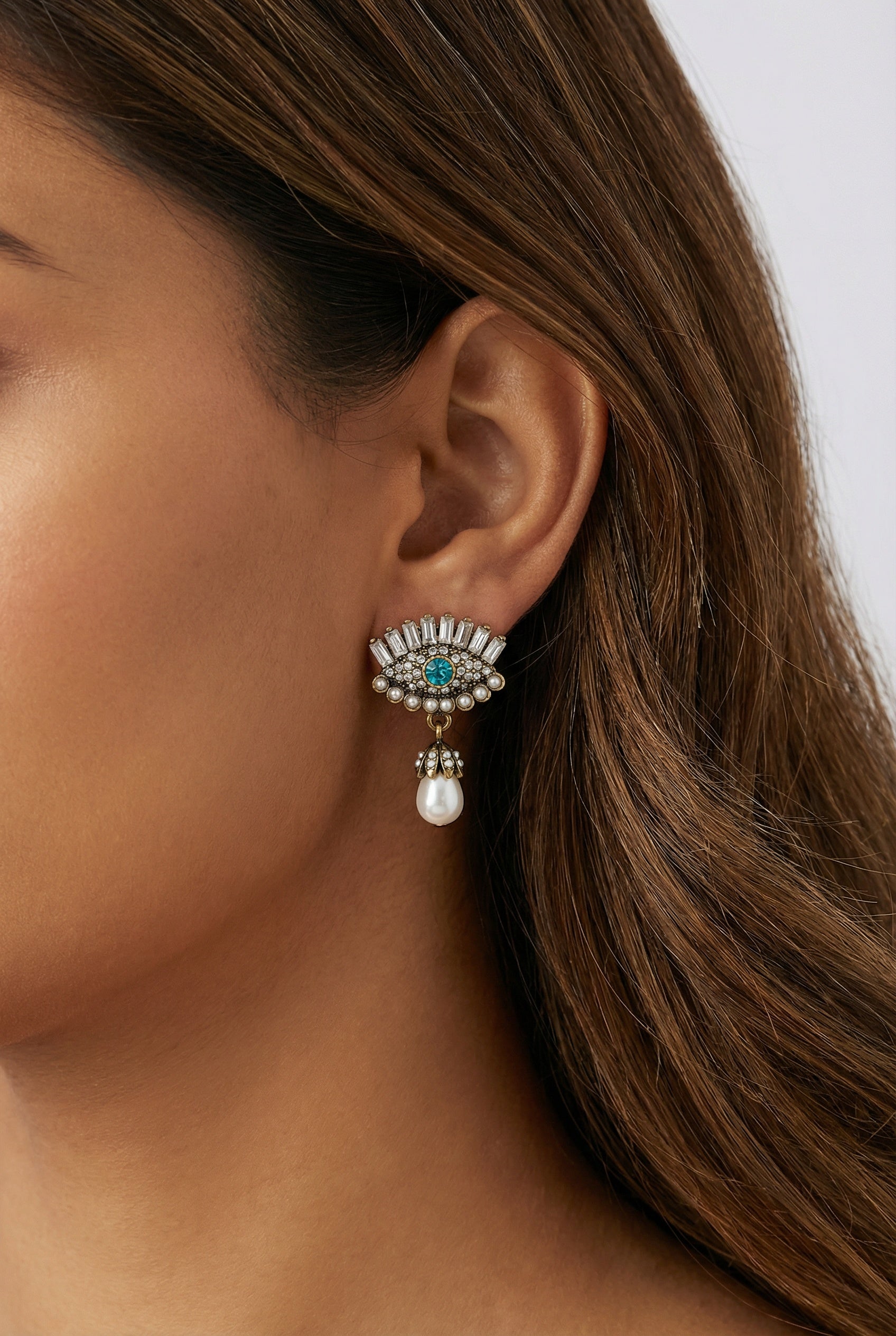 The Aurora Pearl earring is a oxidised silver‑tone with a 18kt gold-plated touch to it and a blue center stone surrounded by sparkling zircons and baguette crystals, topped with a dangling pearl that adds regal elegance to any look.