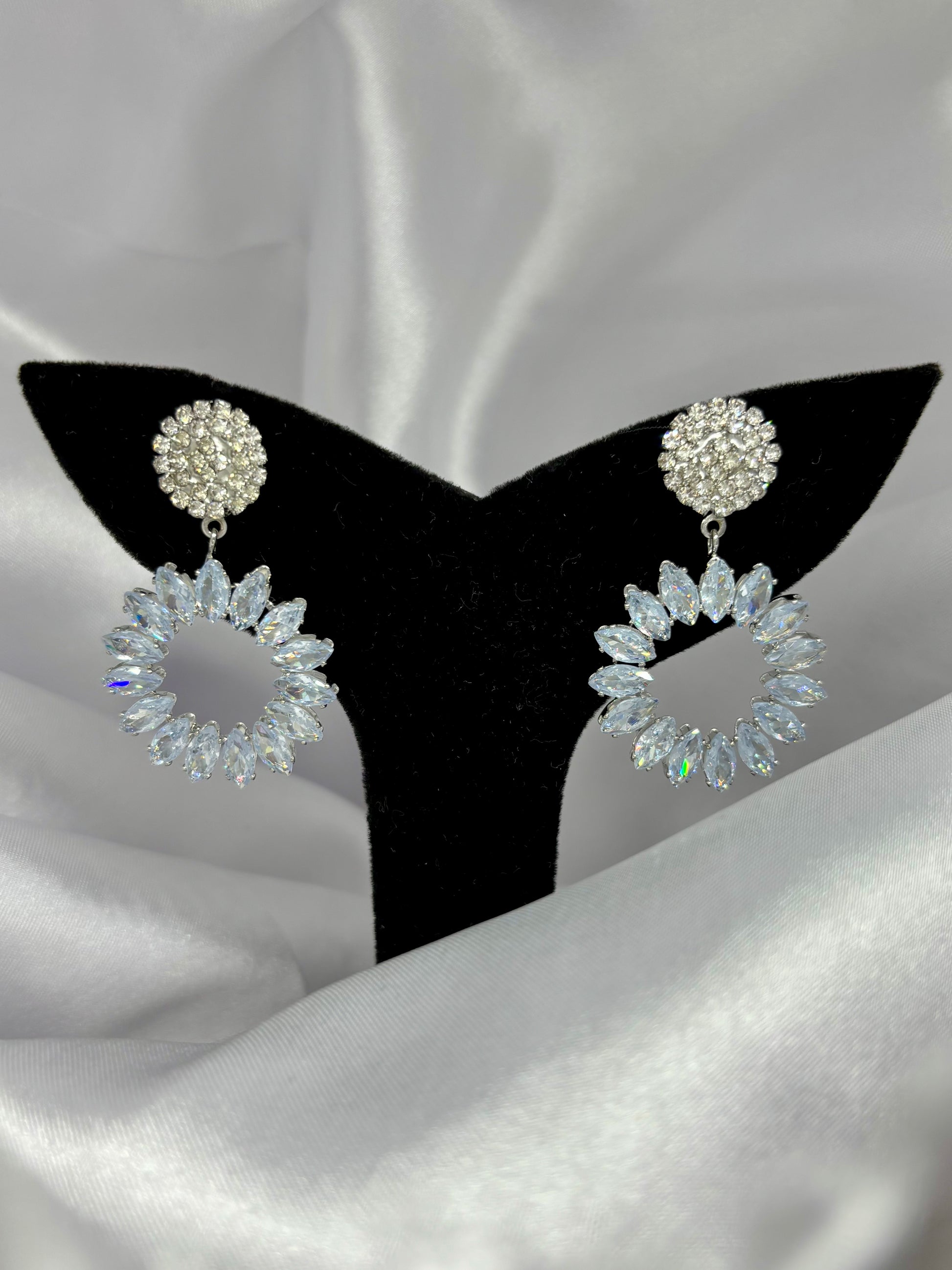These dazzling silver‑tone earrings feature a circular stud packed with sparkling zirconia, from which hangs an elegant hoop of marquise‑cut crystal stones that form a luminous, eye‑catching circle. Crafted for glamour, they catch the light with every movement, turning any outfit into a statement of sophistication and festive sparkle, perfect for weddings, parties, or any occasion that calls for standout shine.