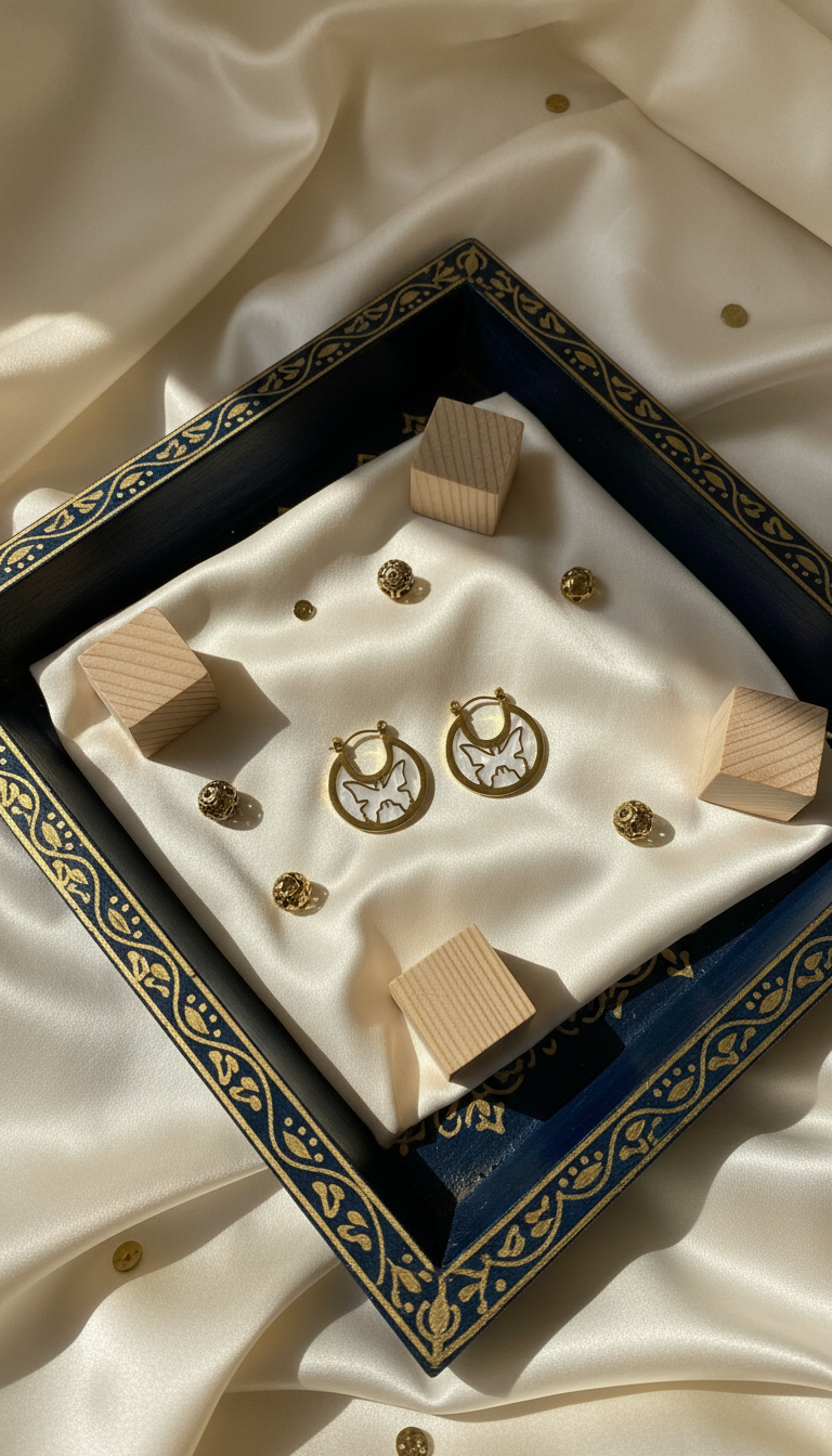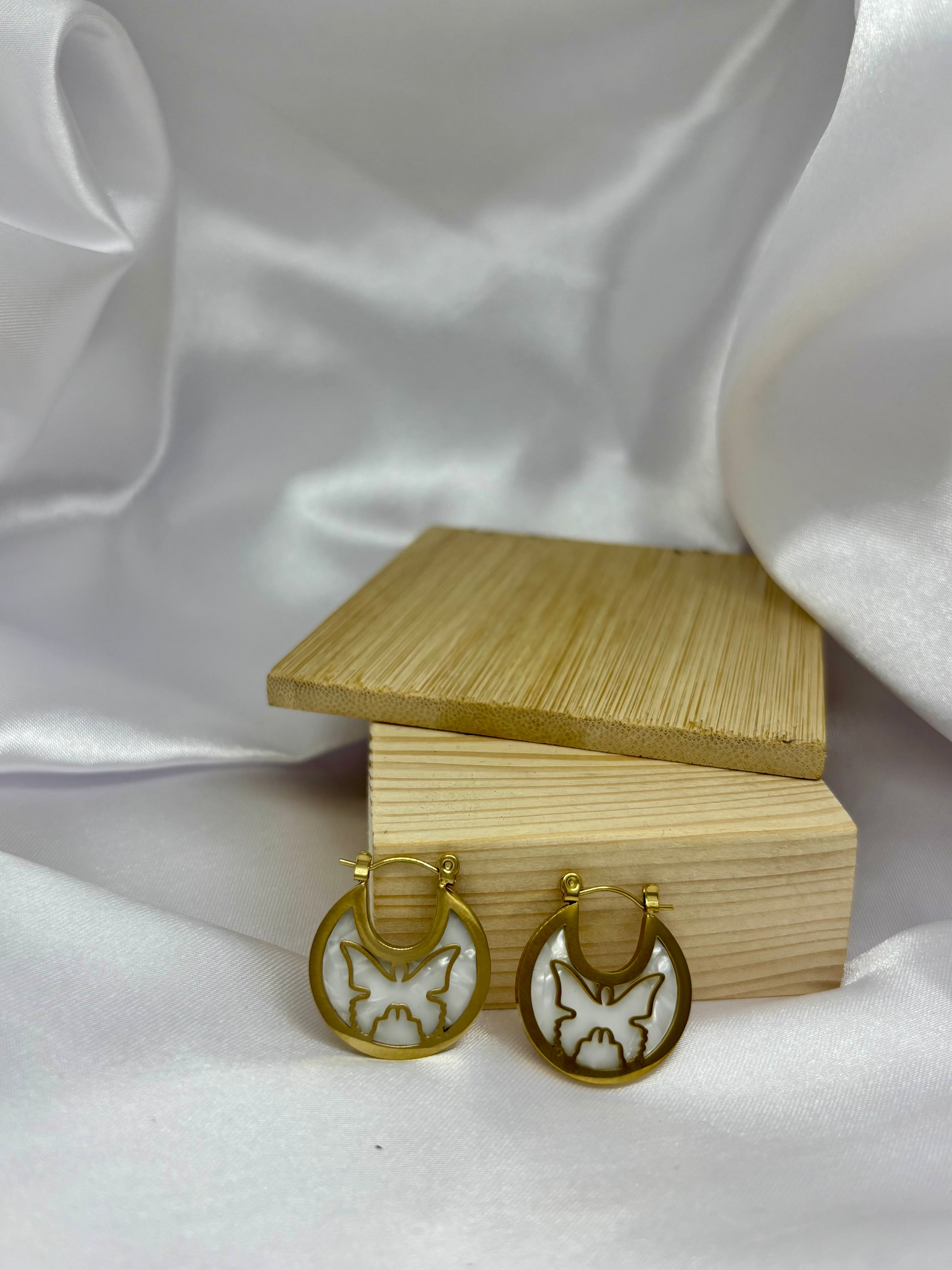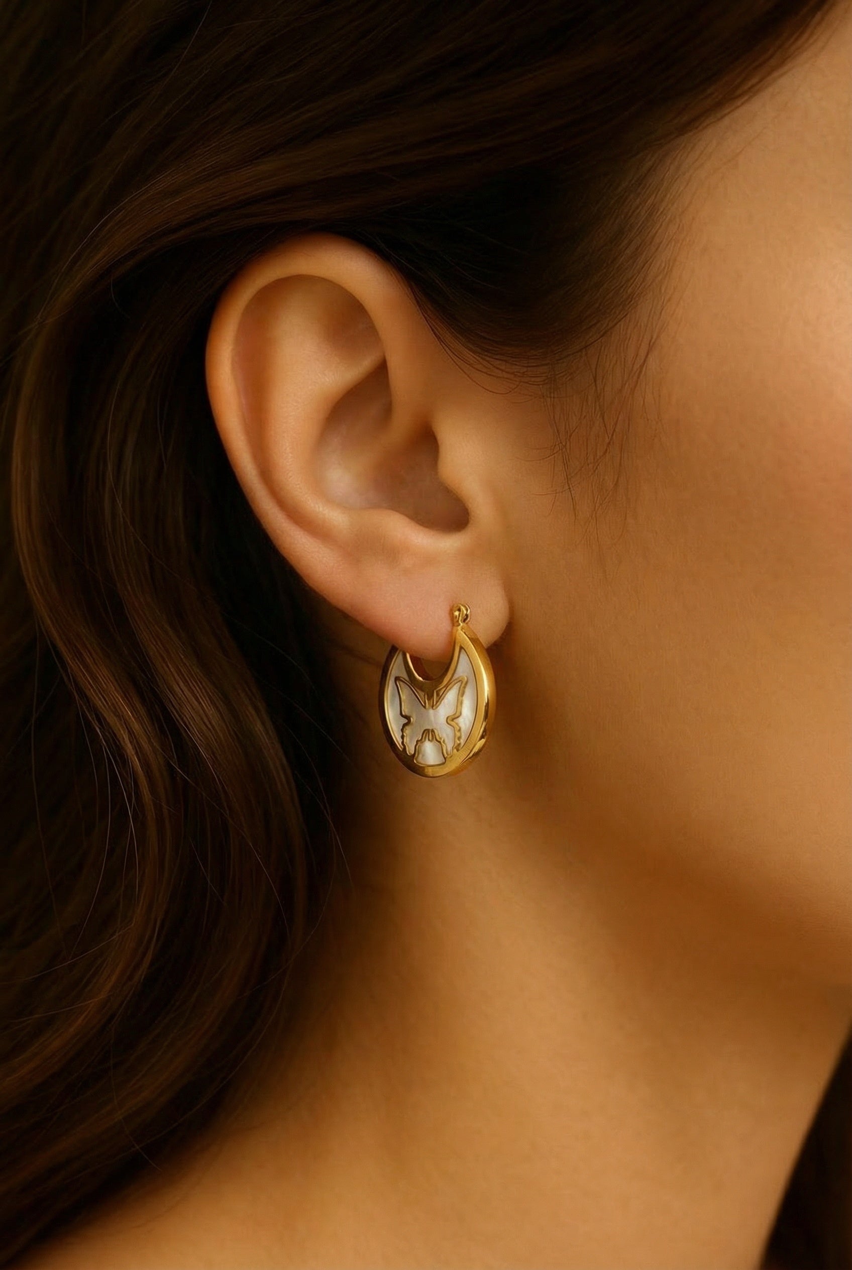 The 18kt gold‑plated butterfly earring with a white enamel inlay is a sleek, everyday‑ready accessory that adds a touch of elegance to any look. Crafted with a delicate oval hoop, the piece features a finely detailed butterfly motif set against a luminous white background, giving it a fresh, modern vibe. Perfect for brunch dates or office wear, the earring balances subtle sophistication with a playful charm, making it a go‑to choice for women who love statement jewelry without the bulk. Its lightweight design ensures comfort all day, while the gold finish catches the light for a refined sparkle.